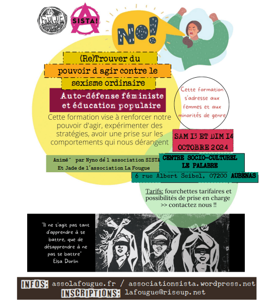 -Les formateurices: Nyno de l’asso sista, formatrice d’auto-défense féministe, formée à la méthode Garance , fondée dans les années 2000 et inspirée du Seito Boei, méthode d’autodéfense autrichienne et Jade de la Fougue, formée au théâtre de l’opprimé.e (théâtre forum), à l’animation de temps d’éducation populaire autour des questions de sexisme et de violences sexistes et sexuelles.