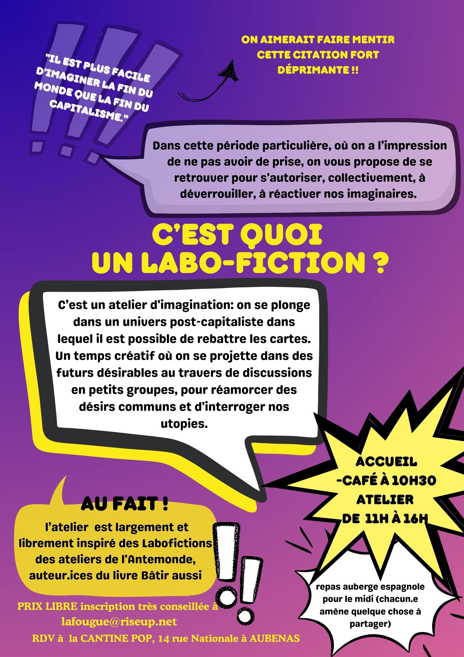 de 11h à 16h Labo fiction > un atelier d’imagination autour de futurs désirables (il s’agit de discussions en petits groupe et pas d’un atelier d’écriture)