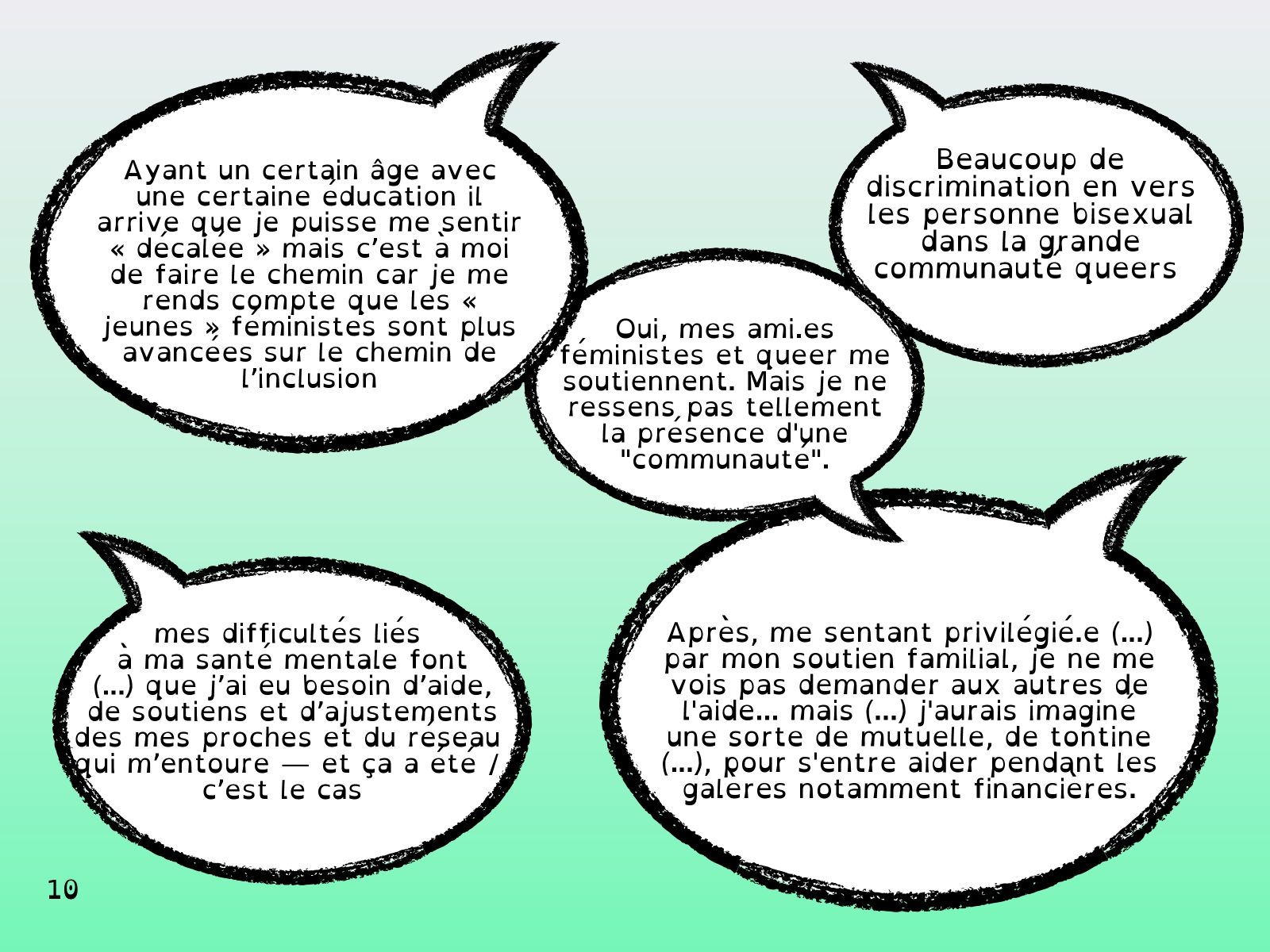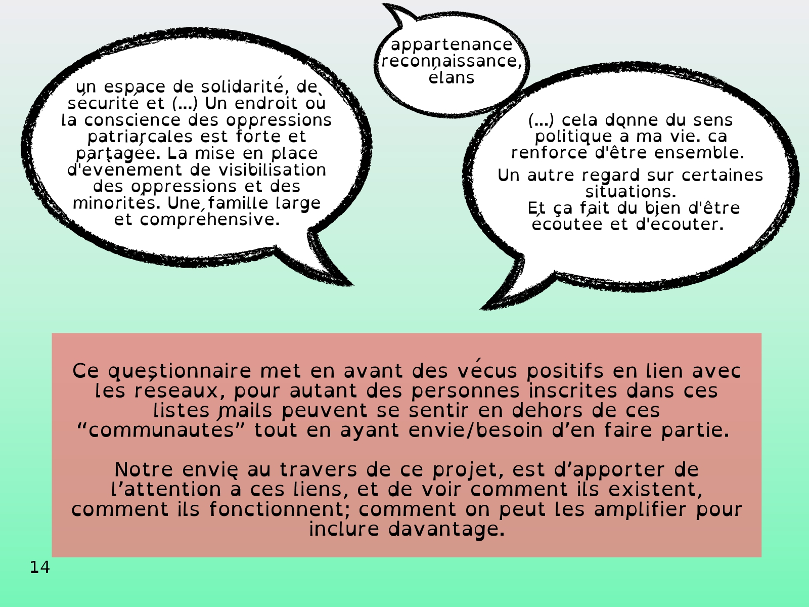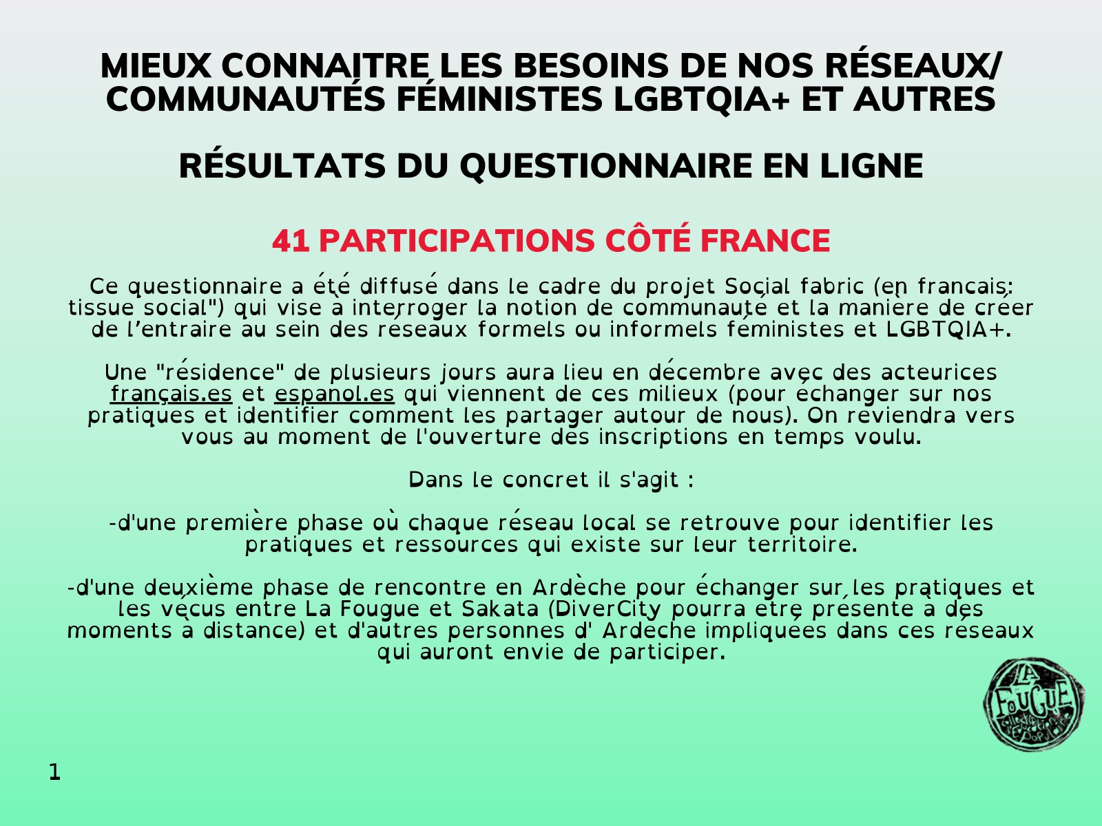 A suivre, la synthèse d’un questionnaire diffusé par la Fougue à l’automne dernier pour mieux capter les enjeux liés à ces questions. C’est tout anonymisé et c’est juste des grandes tendances qui ressortent, illustrées de commentaires des répondant.es.
