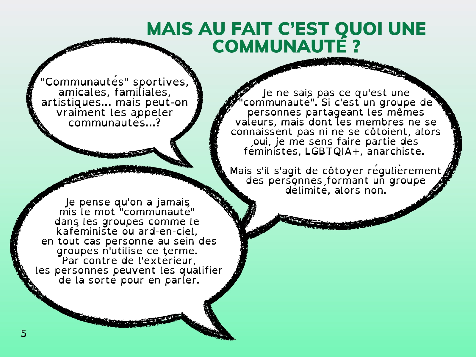 Le but : réfléchir ensemble à la manière dont la notion de communauté* résonne pour nous, et dégager des pratiques de soin/ d’entraide/ de soutien mutuel/ d’apprentissage entre pairs au sein de nos groupes (les pratiques déjà existantes ainsi que celles dont on aurait envie!).