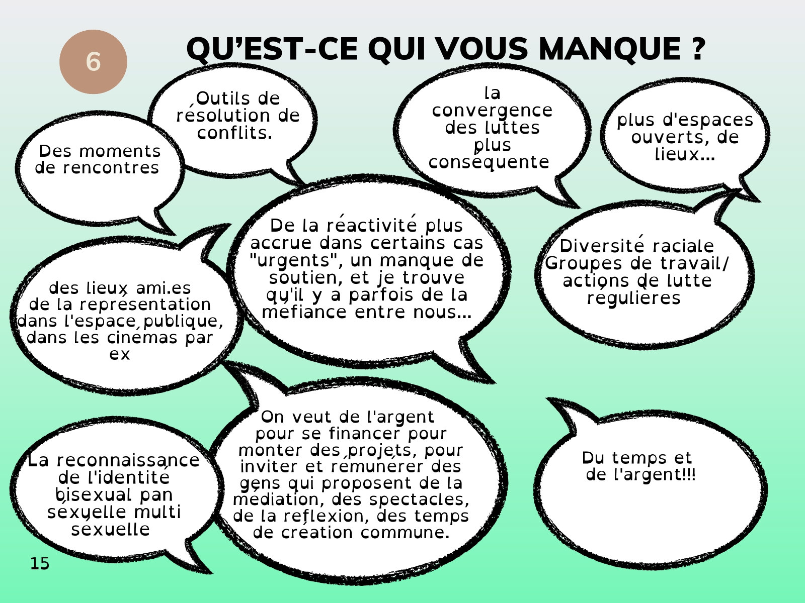 Cette phase a été imaginé comme une enquête collective, qui part des personnes concernées, afin d’aller voir ce qui se passe dans nos communautés et comment aller les interroger. Pour cela nous nous sommes appuyés sur des méthodes d’entretiens inspirées par plusieurs mouvements de transformation sociale qui ont comme point de départ la parole des personnes concernées. Nous avons crée un: