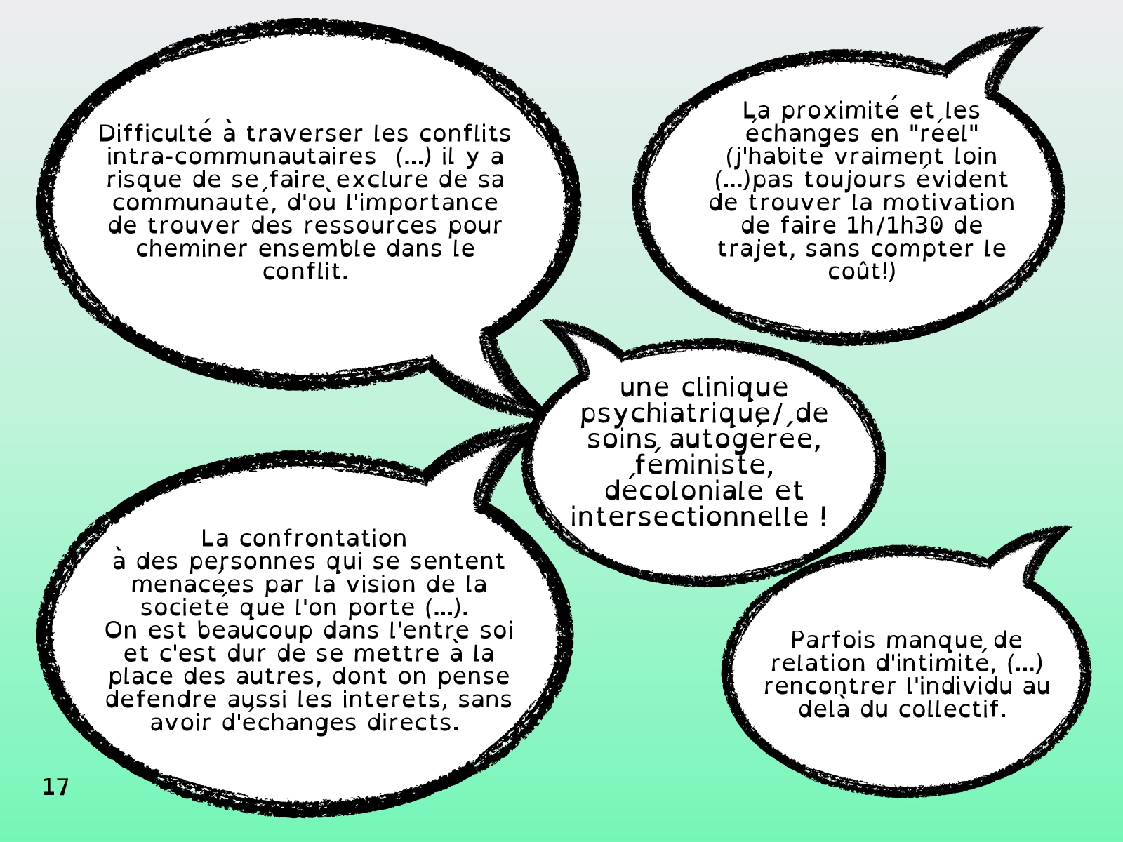 Identification des vécus, en identifiant les ressources et manques autour de comment faire collectifs et en prendre soin.