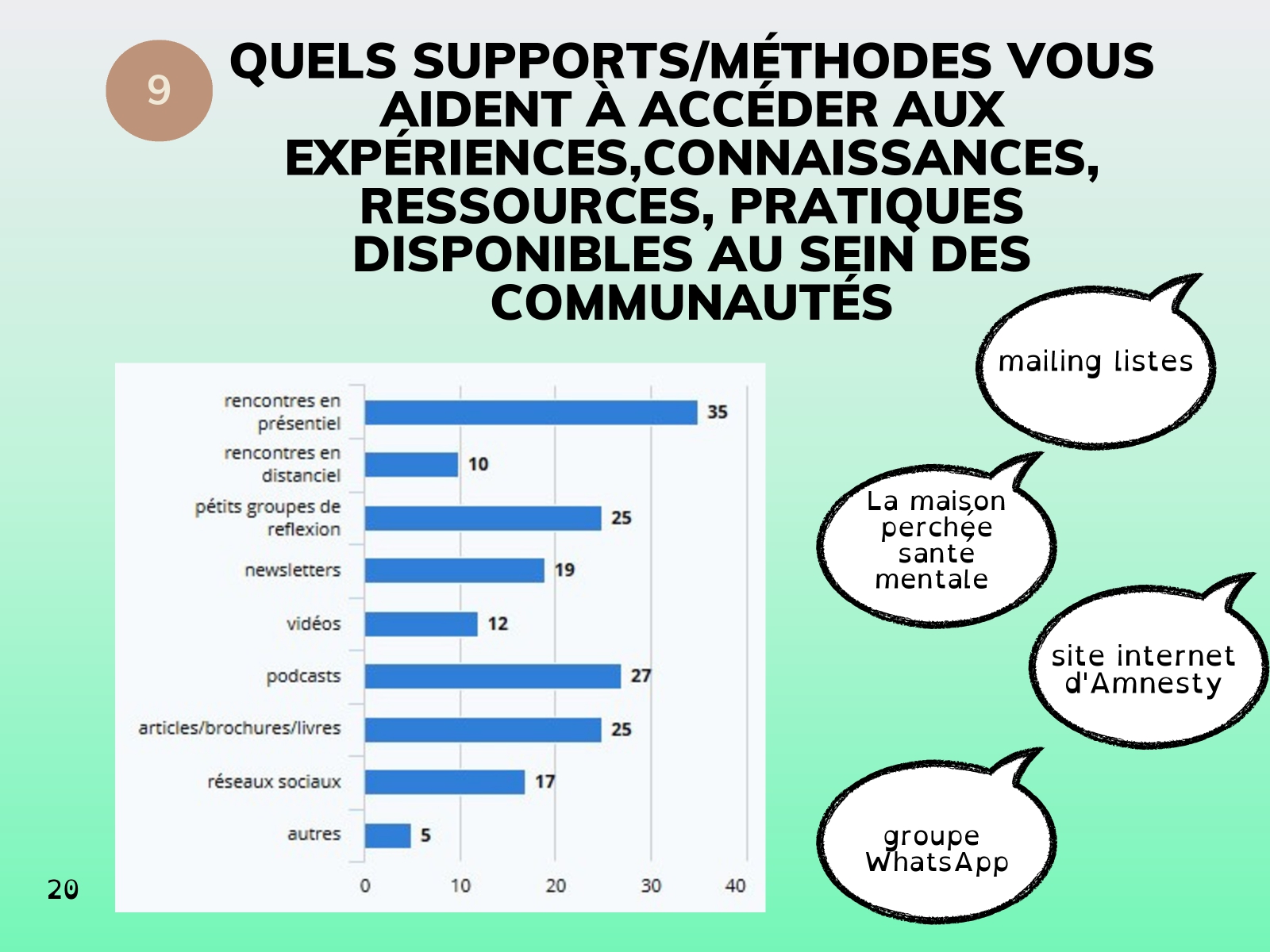 Nous avons organisé 3 temps de réflexion collectifs avec des méthodes d’éducation populaire qui ont permis de dégager des pratiques d’entraide et soutien mutuel/ d’apprentissage entre pairs au sein de nos groupes (les pratiques déjà existantes et celles à développer).