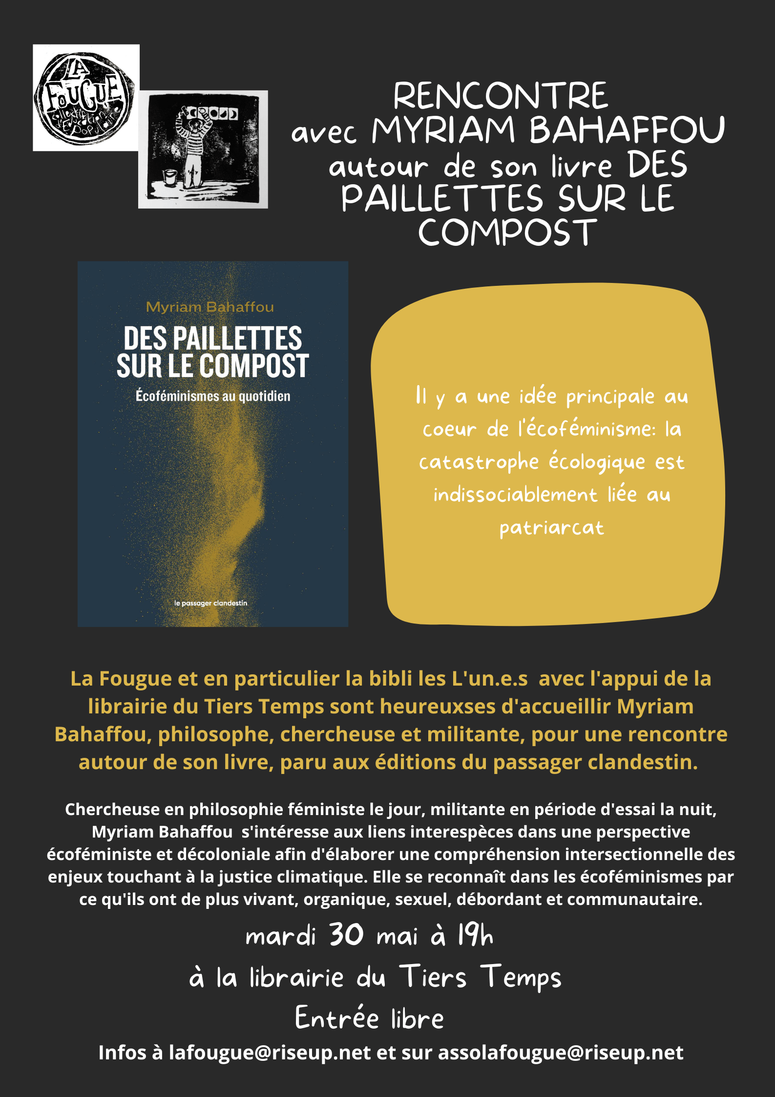 - Le mardi 30 mai à 19h : on a invité l’autrice Myriam Bahaffou pour échanger autour de son livre Paillettes sur le compost, à la librairie du Tiers temps