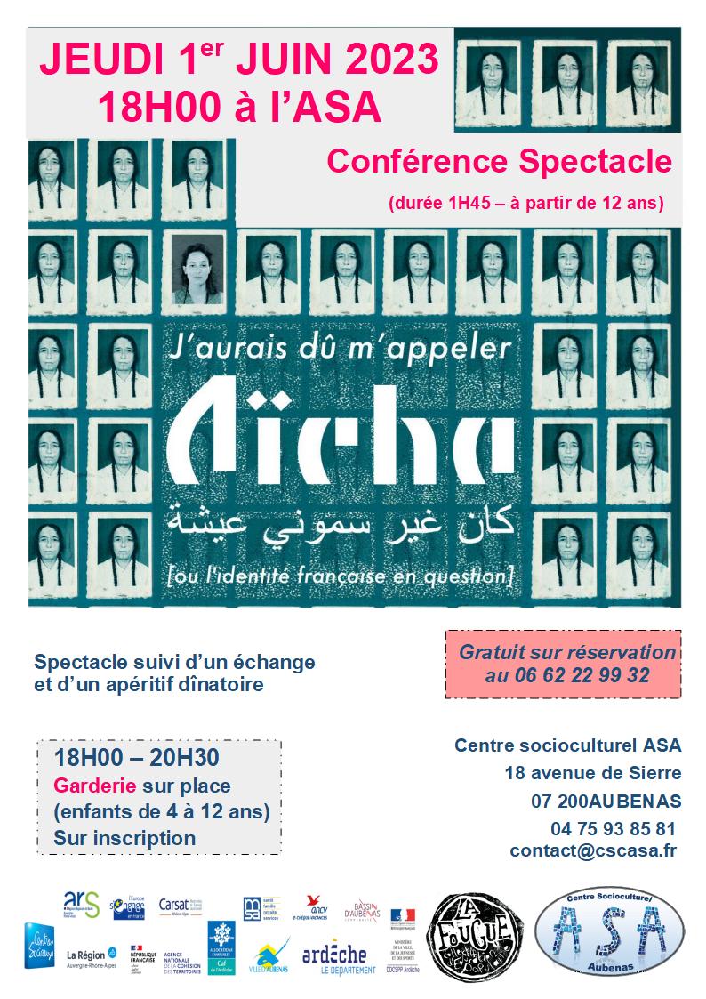 - Le jeudi 1er juin à 18h avec le centre social ASA, on accueillait la conférence gesticulée « J’aurais dû m’appeler Aïcha » par Nadège de Vaulx au centre social ASA –